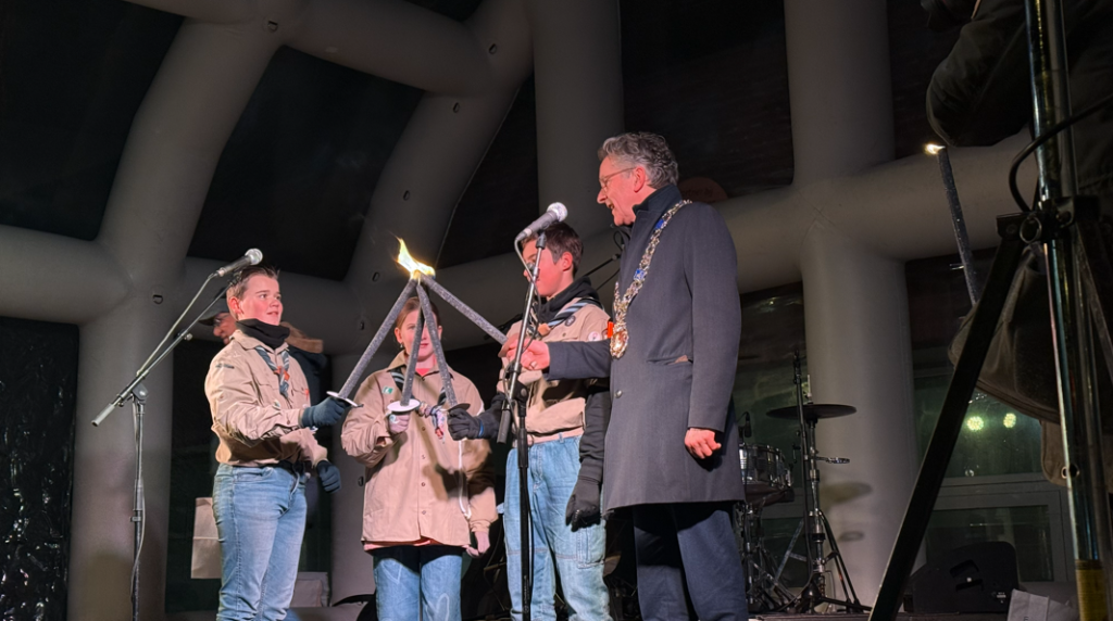 Dan volgt het ritueel waarmee de fakkeltocht zichzelf elk jaar opnieuw verklaart: het vuur dat wordt doorgegeven. De eerste fakkel wordt ontstoken met de World Peace Flame, samen met de scouting en burgemeester Jeroen Dijsselbloem. Daarna gaat het snel. Eén licht wordt twee, twee worden tien, en binnen enkele minuten zijn het er honderden. De straat verandert. Niet door fel licht, maar door een warme gloed van kleine vlammen die samen een schijnsel maken dat de stad en de koude wind even laat vergeten.