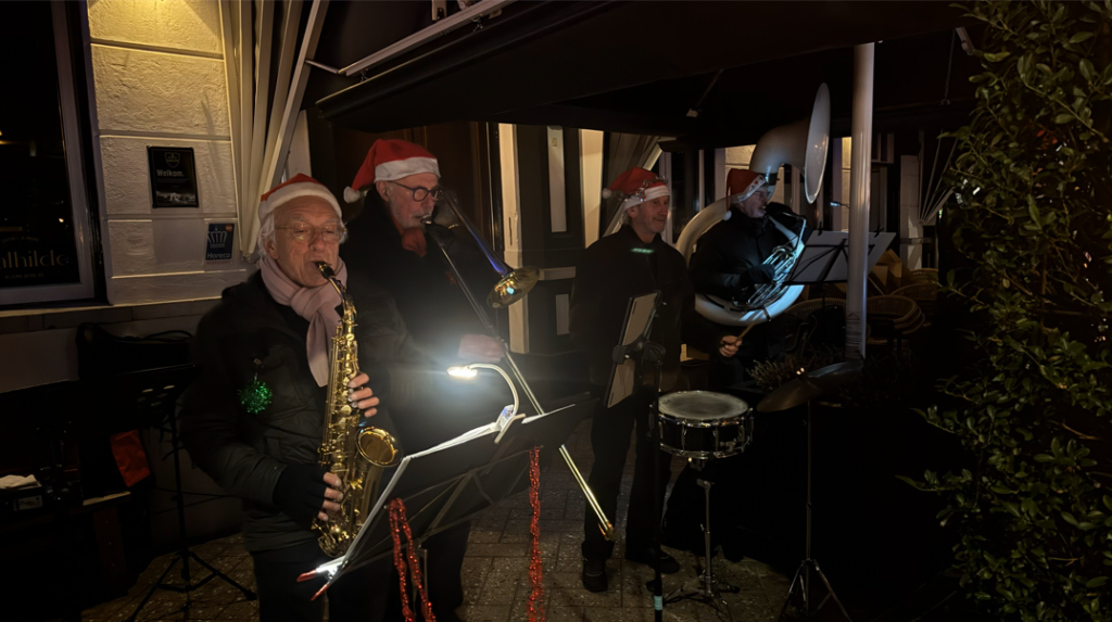 Langs de route klinkt muziek; soms is het alsof de tocht een zachte mars wordt naast een band. Even later duikt een lied op dat vanzelf bij de fakkels in het donker past: This Little Light of Mine. Het geeft de stoet iets van een nachtmis, maar dan buiten: geen kerkbanken, wel kou, wind en kleine vlammen die samen een soort warmte vormen.