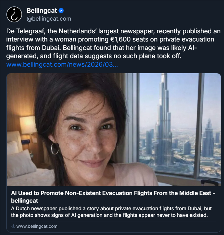 Volgens onderzoeksjournalist Foeke Postma van onderzoekscollectief Bellingcat blijkt een artikel in De Telegraaf over Nederlanders die zelf evacuatievluchten uit Dubai zouden hebben georganiseerd grove fouten te bevatten. Het gaat onder andere om een nepfoto die met AI is gegenereerd.