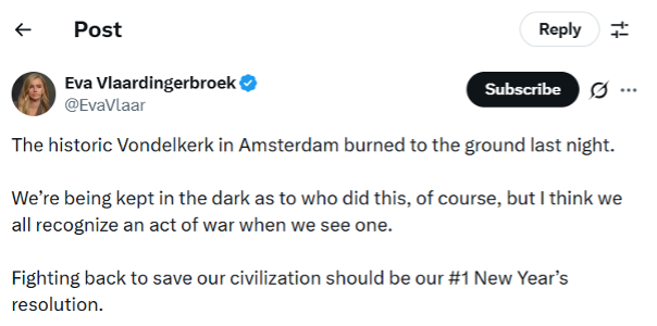 Volgens directeur Jelle Postma, voormalig AIVD-medewerker, is sprake van een georganiseerde desinformatiecampagne. Hij stelt dat op 1 en 2 januari ongeveer 20 procent van de berichten op X een link legde tussen de brand en moslims. ‘Al een paar minuten na het nieuws over de brand zien we de eerste valse claims verschijnen’, zegt hij tegen de NOS.