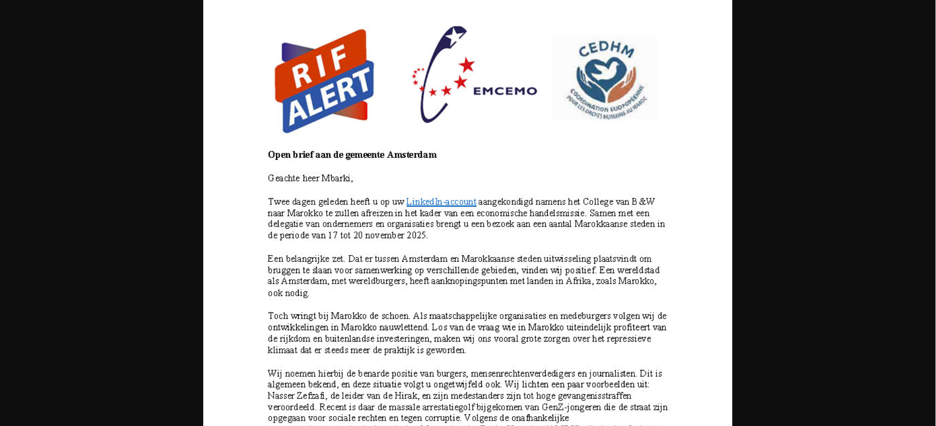 De brief is ondertekend door de Marokkaanse mensenrechtenorganisaties Rif Alert, EMCEMO en CEDHM (Coordination Européenne pour les Droits Humains au Maroc).