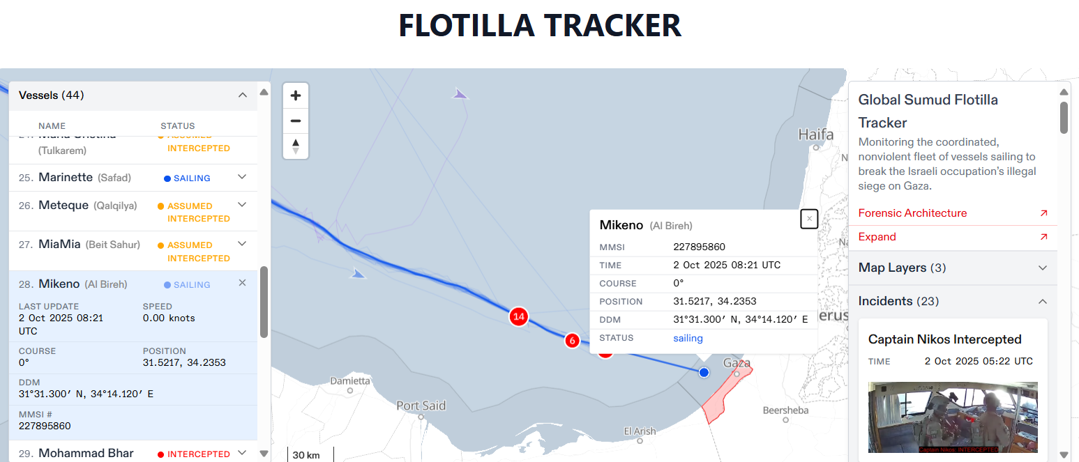Volgens berichten in de vroege ochtend zouden er op dit moment nog vijf activisten op zee zijn. De life tracker van de Flotilla laat rond het middaguur zien dat er nog vier schepen op zee zijn: de Marinette, de Mikeno, de Shireen en de Summertime – Jong.