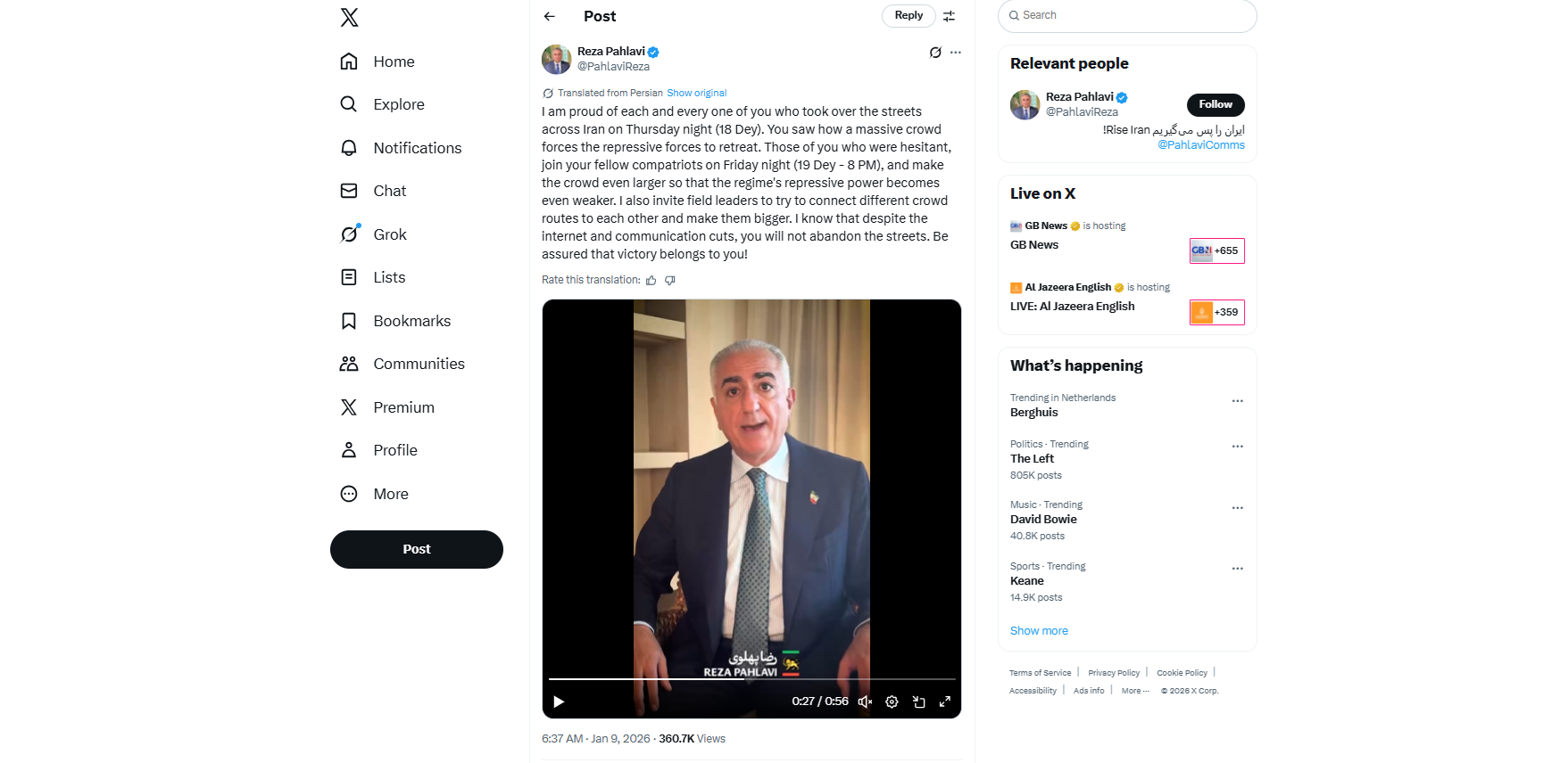 Hier speelt Pahlavi op in. Deze week deelde hij op X naar eigen zeggen zijn ‘eerste call to action’. Donderdagavond gaven veel Iraniërs hieraan gehoor. Om 20.00 uur gingen demonstranten overal in het land de straat op.