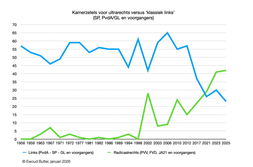 En dat is een probleem. Forum voor Democratie bouwt namelijk succesvol aan een brede beweging en vormt een directe bedreiging voor de rechtsstaat en voor minderheden (migranten, mensen van kleur, lhbtiq+-personen). Dat komt omdat FvD deze groepen structureel wegzet als probleem en tegelijk de instituties aanvalt die hen moeten beschermen. Is FvD dan de enige die dit doet? Nee, de PVV en, in mindere mate, JA21 doen dit ook. Samen vormen ze een groot ultrarechts blok in de Tweede Kamer dat inmiddels bijna twee keer zo groot is als de traditioneel linkse partijen PvdA, GroenLinks en SP.