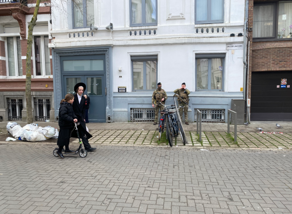 Rond het Antwerpse Centraal Station bepalen sinds kort soldaten met karabijnen, vaak met gezichtsbedekking, mede het straatbeeld van de Joodse wijk. Al dwalend door de straten wordt duidelijk dat ze Joodse instellingen bewaken, zoals gebedshuizen en scholen. Veelal patrouilleren ze in duo’s.