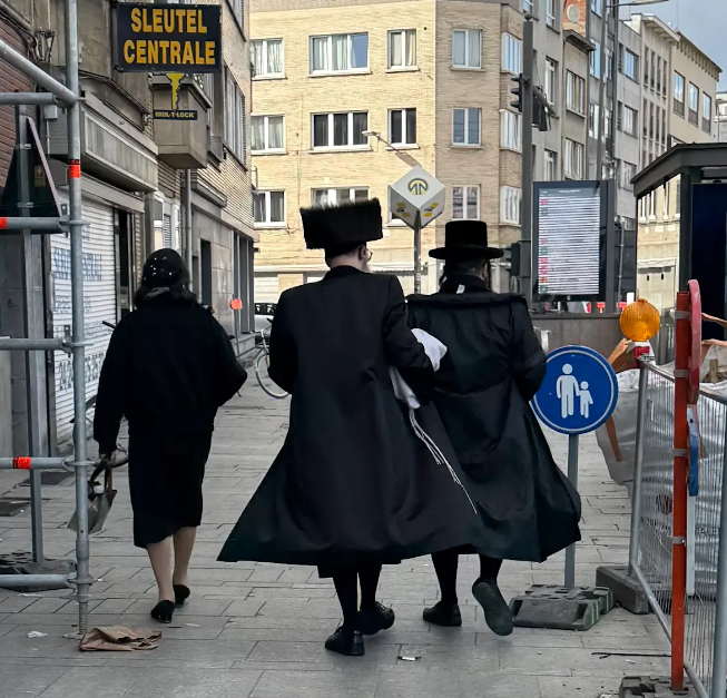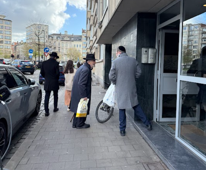 Ze passeren orthodoxe, chassidische mannen, die met hun karakteristieke hoge bontmutsen, de shtreimels, bijna net zo opvallen als de militairen zelf. Daartussen spelen jonge Joodse kinderen. Jongens met hun pijpenkrullen, pejes, zijn zichtbaar gefascineerd door het wapentuig van de soldaten. Hun zussen en moeders zijn sober gekleed en wat bescheidener aanwezig op straat.