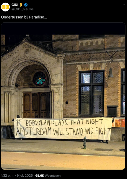 Voorafgaand aan het geplande optreden van Bob Vylan in Paradiso dook er een dreigende banner op. Het X-account van de Joodse belangenorganisatie CIDI plaatste een foto van de bedreiging richting Paradiso: ‘IF BOB VYLAN PLAYS THAT NIGHT, AMSTERDAM WILL STAND AND FIGHT.’ De promoter van de band Gogol Bordello, waarbij Bob Vylan als supportact zou spelen, besloot na de controverse een andere act te boeken.
