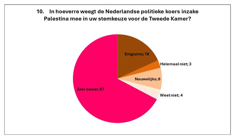 De oorlog in Gaza heeft een zeer grote invloed op de politieke keuzes van biculturele Nederlanders en kan verkiezingsuitslagen mede bepalen. Voor een ruime meerderheid – twee derde van de respondenten – is de Nederlandse houding ten aanzien van Palestina een doorslaggevende factor bij hun stemgedrag. Dit laat zien dat het Palestijnse vraagstuk niet alleen een moreel of geopolitiek onderwerp is, maar ook direct invloed heeft op politieke voorkeur en bereidheid om te stemmen binnen deze groep. De kritiek op Israël en de steun voor erkenning van Palestina zijn breed gedeeld, maar het sterkst onder Turkse en Marokkaanse Nederlanders, vooral onder vrouwen.