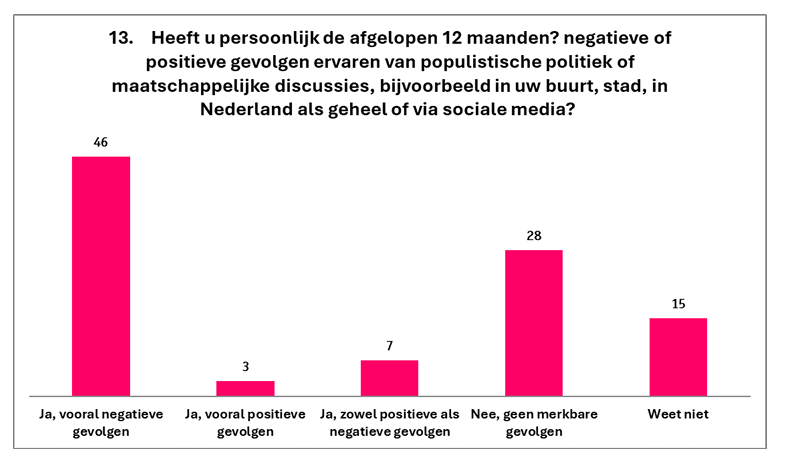 Populistische politiek wordt ervaren als negatief en draagt bij aan polarisatie en wantrouwen. Het thema ligt vooral gevoelig bij Turkse en Marokkaanse Nederlanders, en bij vrouwen. ‘Het gaat vaak om uitspraken over de hoofddoek die bijdragen aan een gevoel van onveiligheid, zoals het verzonnen verhaal over een vuilnisvrouw die zou zijn mishandeld door een vrouw met een hoofddoek’, zegt El Kaddouri. ‘Ook Surinamers ervaren dit, bijvoorbeeld bij uitspraken van populisten over Zwarte Piet en het slavernijverleden.’