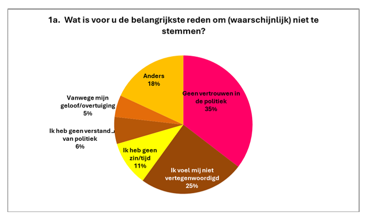 Respondenten die aangeven (waarschijnlijk) niet te gaan stemmen, hebben daar duidelijke redenen voor. De meest genoemde reden is gebrek aan vertrouwen in de politiek. Daarnaast zegt een kwart dat zij zich niet herkennen in bestaande partijen of kandidaten. 22 procent noemt praktische of persoonlijke factoren, zoals geen zin of tijd (11 procent), gebrek aan kennis (6 procent) of geloofsovertuiging (5 procent). Tot slot geeft 18 procent andere redenen, variërend van persoonlijke ervaringen tot teleurstelling in beleid.