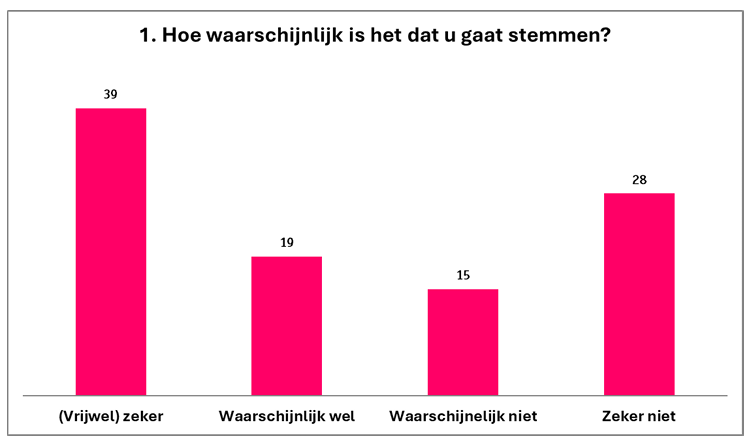 De bereidheid om te gaan stemmen is relatief laag. Van de respondenten zegt 39 procent (vrijwel) zeker te gaan stemmen. 19 procent zegt waarschijnlijk wel te stemmen, 15 procent waarschijnlijk niet en 28 procent helemaal niet.
