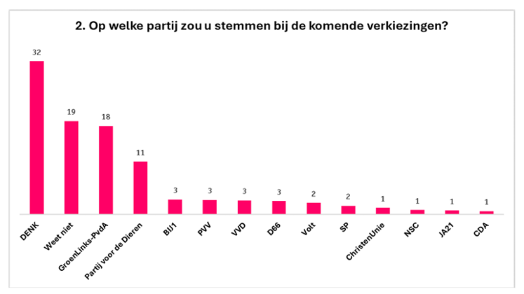 De resultaten laten zien dat de respondenten een uitgesproken voorkeur hebben voor bepaalde politieke partijen. ‘Denk heeft een sterke positie, vooral onder Turkse en Marokkaanse Nederlanders’, zegt Aziz el Kaddouri, directeur van het Opiniehuis. ‘GroenLinks-PvdA en de Partij voor de Dieren trekken daarentegen vooral Surinaamse en Caribische Nederlanders aan.’