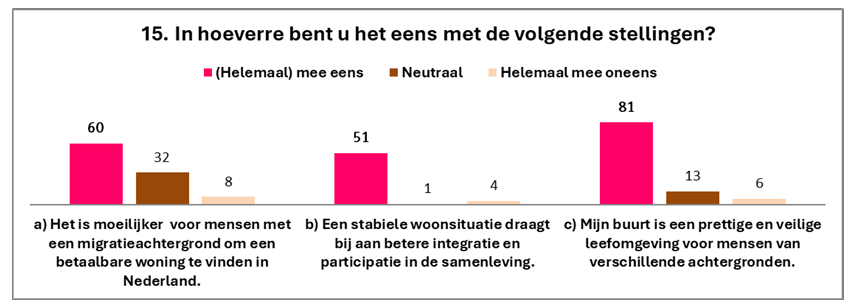 Op het gebied van wonen zijn er duidelijke verschillen naar migratieachtergrond. Turkse en Marokkaanse Nederlanders benadrukken sterker hoe moeilijk het is om een betaalbare woning te vinden en zien stabiele huisvesting als essentieel voor integratie. Surinaamse en Antilliaanse Nederlanders zijn vaker neutraal over de woningmarkt, maar hechten juist veel waarde aan een veilige en prettige buurt. Onder mensen met andere migratieachtergronden lopen de meningen uiteen, van neutraal tot (helemaal) mee eens.
