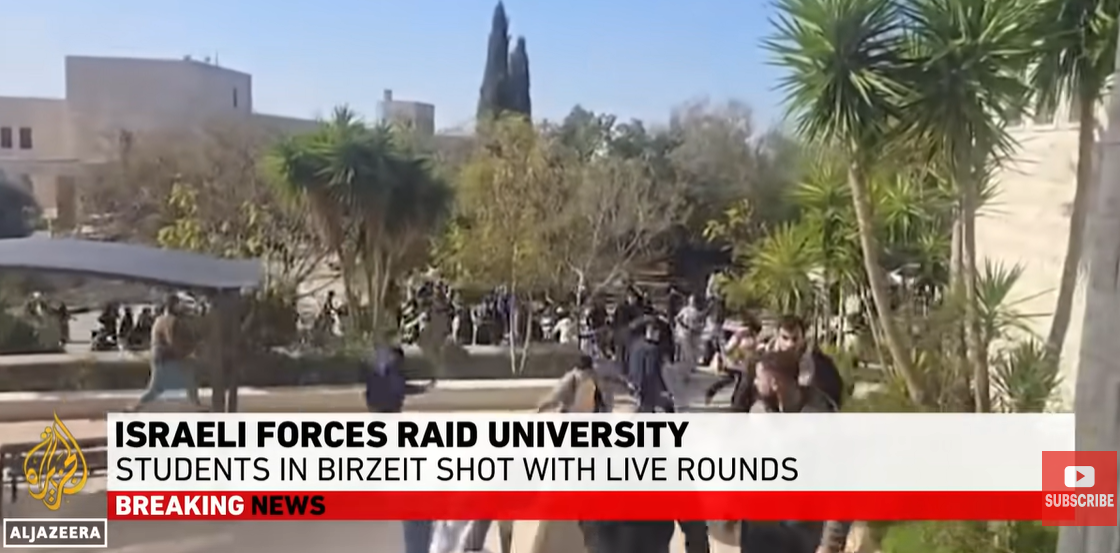 Een normale collegedag aan de Birzeit-universiteit op de Westoever verandert in chaos wanneer het Israëlische leger de campus binnenvalt. Tijdens de inval raken elf studenten gewond. Studenten en docenten spreken van intimidatie en een aanval op het recht op onderwijs.