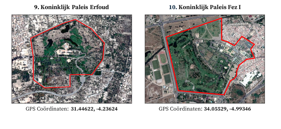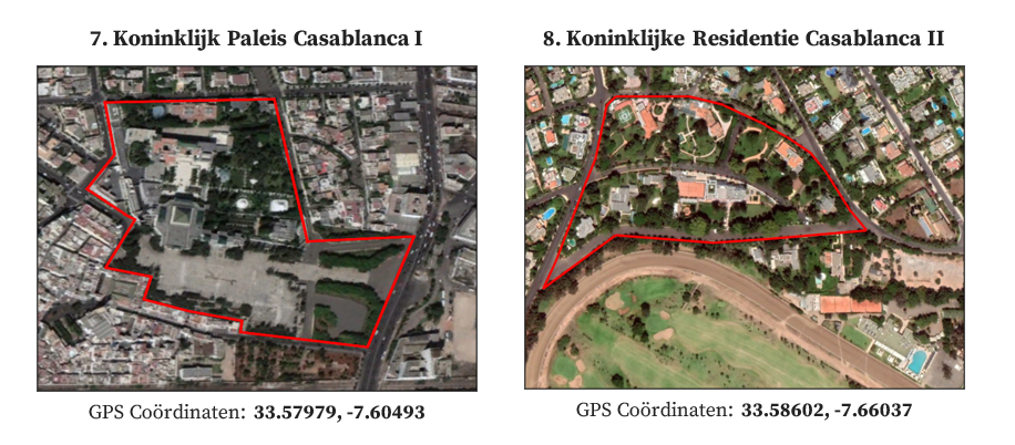 *Selectie satellietfoto’s van koninklijke paleizen en residenties in Marokko. Oppervlakte is gebaseerd op de perceelbegrenzing van de muren rondom het vastgoed en de beveiliging langs de muren.